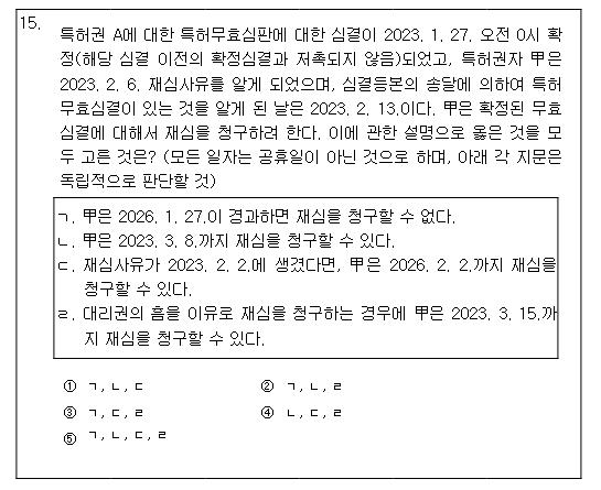 올해 2월에 시행된 2023년 제60회 변리사 1차 시험에서 불합격처분을 받은 수험생 ㄱ씨는 '산업재산권법' 15번 문제에 대해 행정심판을 제기했다. 한국산업인력공단에서 ②번을 정답으로 발표했으나 이는 위법·부당하다는 이유였다.