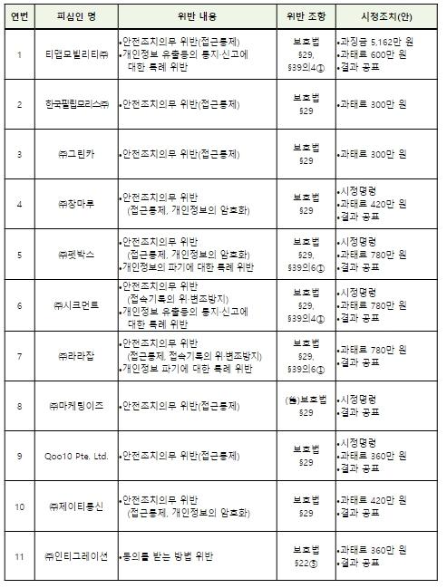 개인정보위는 개인정보 유출 신고, 개인정보 침해 신고에 따라 사실조사에 착수했으며, 조사 결과 10개 사업자가 안전조치의무를 위반하고, 1개 사업자가 동의를 받는 방법을 위반한 사실을 확인했다.