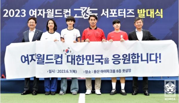 대한축구협회는 1일 오전 서울 용산아이파크몰 풋살장에서 '2023 여자월드컵 고강도 서포터즈 발대식'을 개최했다. 행사에는 박보균 문화체육관광부 장관, 정몽규 대한축구협회장, 여자대표팀의 이금민 선수와 함께 고강도 서포터즈 첫 멤버로 위촉된 전 국가대표 김태영과 배우 박선영, 정혜인이 참석했다.