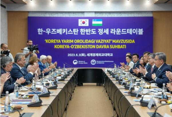 [중앙방송, 김정아기자] 박진 외교부 장관은 6.3일 오전 타슈켄트 소재 세계경제외교대학에서 우즈베키스탄 주요 학계·싱크탱크 전문가들을 초청하여 ‘한-우즈베키스탄 한반도 정세 라운드테이블’을 개최하고, 한반도 정세와 북한 비핵화 및 역내 자유?평화?번영을 위한 양국간 협력방안에 대해 논의했다.
