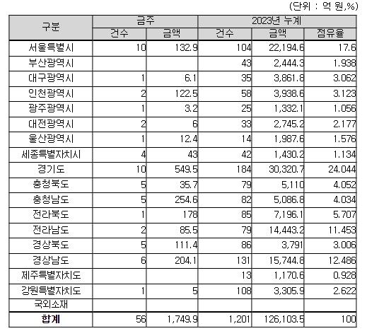 지역별로는 경기도 550억 원, 충청남도 255억 원, 경상남도 204억 원, 그 밖의 지역이 741억 원이다.