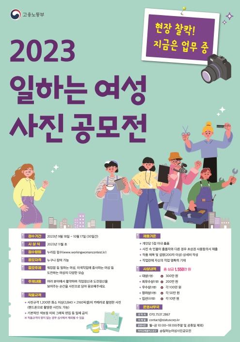 이정한 고용정책실장은 “여성의 경제활동 참여 확대는 개인에게 중요한 의미가 있을 뿐만 아니라, 생산인구 감소라는 국가적 위기를 돌파하고 성장 잠재력을 강화하는데 반드시 필요한 국가적 과제이다”라고 강조하며 “이번 사진 공모전을 통해 일하고 싶어도 선뜻 용기를 내지 못하고 있는 여성들에게 용기를 주고, 여성들이 새롭게 도전할 수 있는 분야가 더 넓고 다양하다는 점을 알릴 수 있는 계기가 되길 바란다.”라고 밝혔다.