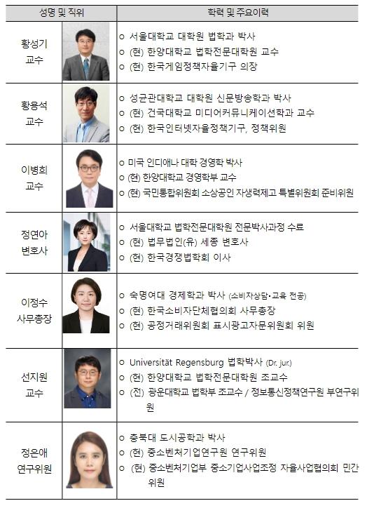 분쟁조정협의회 위원은 배달 플랫폼 사업자와 중소기업?소상공인 단체 간의 협의를 거쳐 7인으로 구성됐다. 초대 위원장으로는 황성기 교수(한양대 법학전문대학원)가 위촉됐으며, 위원으로는 황용석 교수(건국대 미디어커뮤니케이션학과), 이병희 교수(한양대 경영학과), 정연아 변호사(법무법인(유) 세종), 이정수 사무총장(한국소비자단체협의회), 선지원 교수(한양대 법학전문대학원), 정은애 연구위원(중소벤처기업연구원)이 위촉됐다.