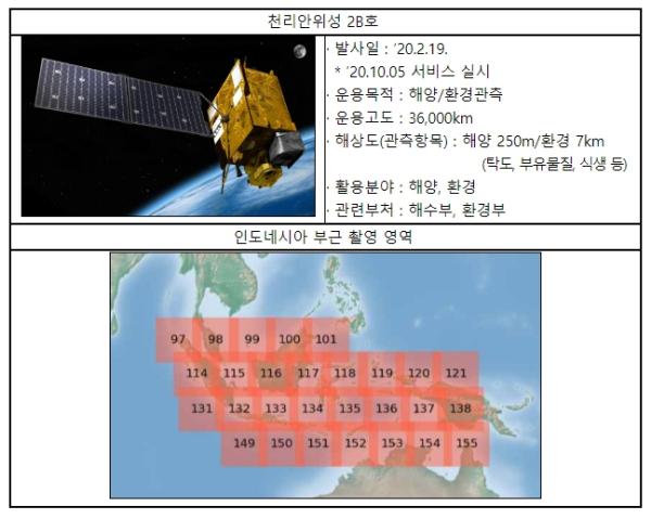 주요 사업 내용은 인도네시아 해역에 대한 천리안위성 2B호 위성정보의 수집·분석·관리 시스템 구축 및 융복합 활용 기술개발, 공동 해양조사, 전문 인력 양성 교육 등이다. 이번에 체결한 이행약정에는 양국 간 천리안위성 2B호 활용에 대한 책임, 의무, 지원, 분담 등 세부사항을 정하고 있어 사업 추진력을 더 높일 수 있을 것으로 기대된다.