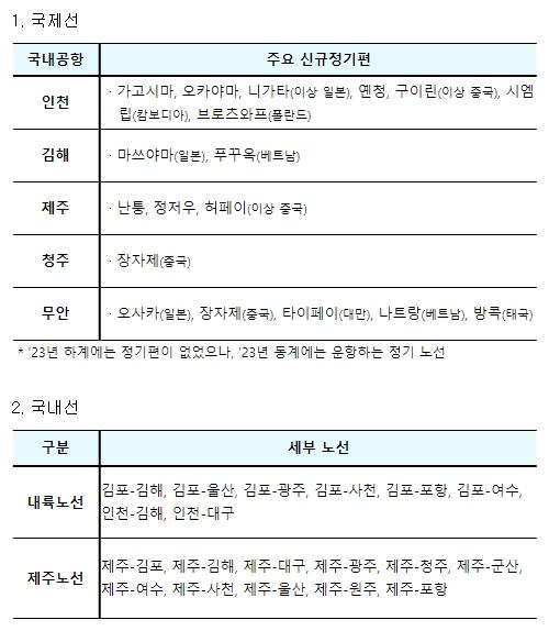 특히, 동계기간 수요가 많은 일본(+108회), 동남아(+152회), 대양주(+8회) 노선이 증편(’23.9월 대비)됐으며, 인천-브로츠와프(폴란드), 김해-푸꾸옥(베트남), 제주-허페이(중국), 청주-장자제(중국), 무안-나트랑(베트남) 등 신규 정기노선도 개설된다.