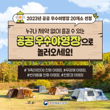 전국 17개 시도에서 추천을 받아 특화 콘텐츠 운영, 안전·위생 기준 등 평가를 통해 총 20곳을 선정했습니다.?가족(어린이) 친화 야영장, 무장애 야영장, 반려동물 친화 야영장, 친환경 야영장 등 분야별로 선정된 우수 야영장에서?안전하고 즐거운 캠핑을 즐겨보세요!