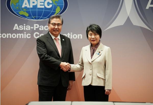 [중앙방송, 김정아기자] 박진 외교부 장관은 샌프란시스코에서 열린 APEC 정상회의 계기 가미카와 요코(上川 陽子) 일본 외무대신과 11월 15일 10:20-11:15(현지시간)간 조찬 겸 한일 외교장관회담을 가졌다.