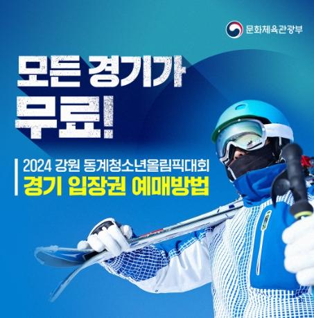 동계 스포츠를 사랑하는 마음으로 전 세계에서 모이는 청소년 선수들을 현장에서 응원하며 힘찬 기운을 함께 나누시죠!?경기가 열리는 지역은 4곳, 종목은 15개! 모든 경기 입장권 무료!?입장권 예매 방법을 카드뉴스로 설명해 드립니다.