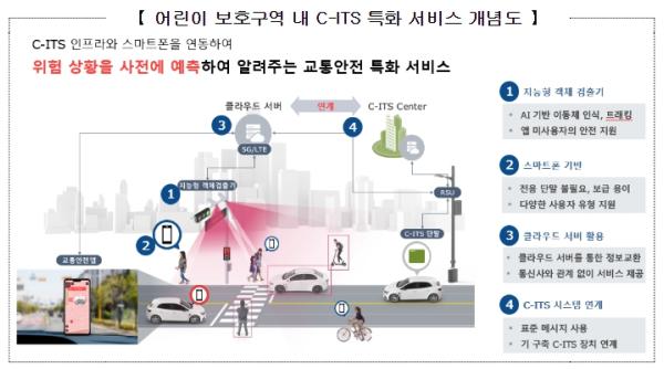 어린이 보호구역 C-ITS 안전 특화 서비스는 CCTV, 라이더(Lidar), 초광대역(UWB) 등 검지장치를 활용하여 차량과 보행자의 정확한 위치정보를 파악하고 이를 별도 단말기 또는 스마트폰 앱을 통해 운전자에게 충돌위험을 미리 경고해 주는 정보를 제공하는 기술이다.