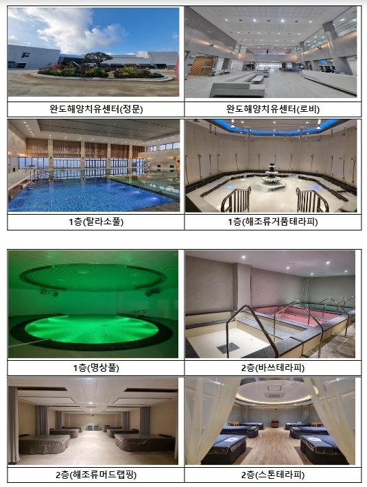 완도 해양치유센터는 지하 1층, 지상 2층 규모로 지어졌으며, 센터에서수중운동, 해조류 거품테라피, 스톤테라피 등 16개 프로그램이 운영될 예정이다. 특히, 2층에서는 개인별 건강상태를 측정하고, 측정된 결과와 자료를 토대로 하는 맞춤형 전문 치유 프로그램이 운영된다. 해양수산부와 완도군은 지난 9월 24일부터 11월 17일까지 완도군민, 및 일반인 등 1,800여 명을 대상으로 센터를 시범 운영한 결과, 이용객들로부터 호평을 받기도 했다.