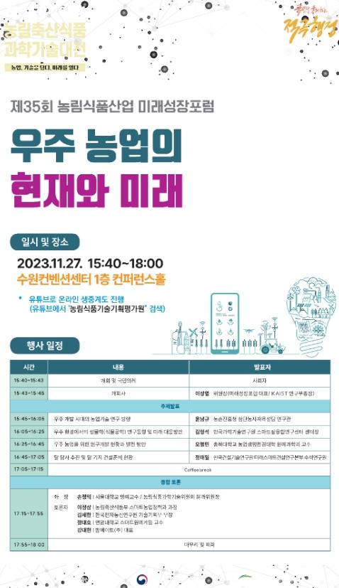 [중앙방송, 손미정기자] 농림축산식품부 주최, 농림식품기술기획평가원(원장 노수현) 주관 ?제35회 농림식품산업 미래성장포럼?이 “우주농업의 현재와 미래”를 주제로 11월 27일 15시 40분 수원 컨벤션센터에서 개최된다.