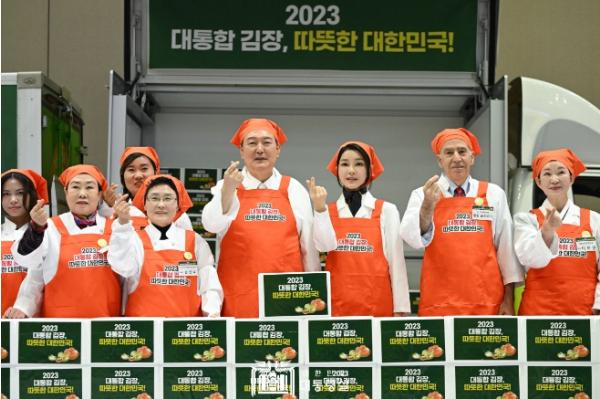 [중앙방송, 이선호기자] 윤석열 대통령 부부는 11월 27일 오후 일산 킨텍스에서 열린 '나눔과 봉사의 국민 대통합 김장행사'에 참석해 자원봉사자들을 격려하고 지역 소외계층 나눔을 위한 김장을 함께 담갔다.