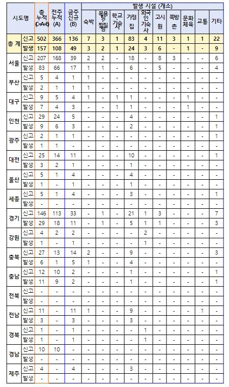 빈대 신고 및 발생 현황은, 지난주(11.20~11.26)에 지자체 등 정부에 136건의 신고(전주 대비 △53건)가 접수됐으며, 이 중 실제 빈대가 발생한 건은 49건(전주 대비 △6건)으로, 민간업체 직접 신고건(21건) 포함시 전체 70건(전주 대비 +2건)이다.