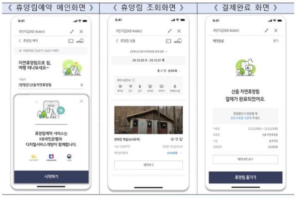 또한, 국립자연휴양림 선착순 예약서비스을 시작으로 내년 중 휴양림 추첨신청 서비스도 추가할 예정이며, KB스타뱅킹에서 제공 중인 반려동물등록증 서비스와 결합하여 동물등록번호 추가 입력 없이 반려동물 전용 객실 예약도 간편하게 이용할 수 있다.