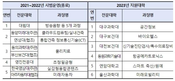 교육부는 2021~2022년에 5개교(3개 연합체, 대학 2개교)를 선정하여 시범 운영했고, 2023년에는 6개교를 마이스터대로 선정·지원했으며, 올해는 전문기술석사과정을 신규로 인가받은 대학 중 3개교를 추가로 선정하여 총 9개교(2023년 6개교+신규 3개교)를 지원한다.