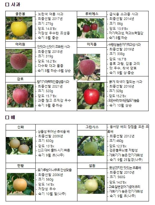 한편, 품종 정보는 농사로 누리집에서 확인할 수 있다. 묘목 문의는 국립원예특작과학원 사과연구센터, 배연구센터로 하면 된다.