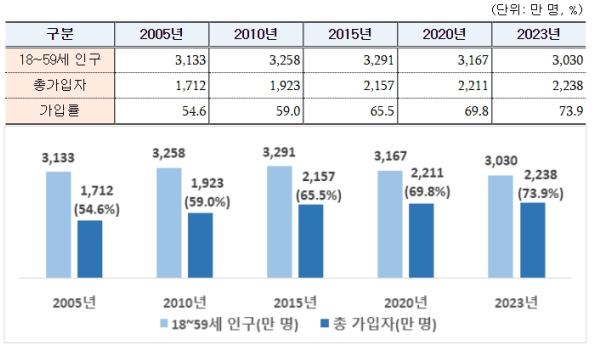 국민연금 가입자는 총 2,238만 명으로 집계됐다. 18~59세 국민연금 가입 대상 인구 대비 가입률은 2022년 73.3% 대비 0.65%p 늘어났으며, 2005년 54.6%를 기록한 이래로 지속해서 상승하고 있다.