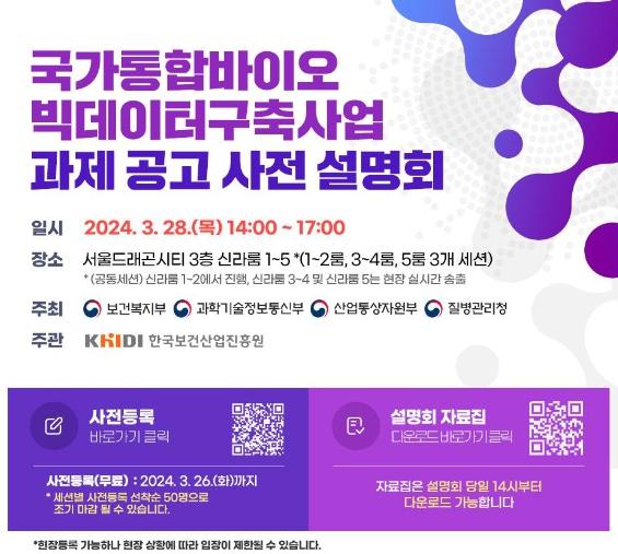 [중앙방송, 서은혁기자] 보건복지부, 과학기술정보통신부, 산업통상자원부, 질병관리청이 주최하고, 한국보건산업진흥원(원장 차순도)이 주관하는 ‘국가 통합 바이오 빅데이터 구축 사업 과제 공고 사전설명회’가 3월 28일 14시 서울드래곤시티 호텔에서 개최됐다.