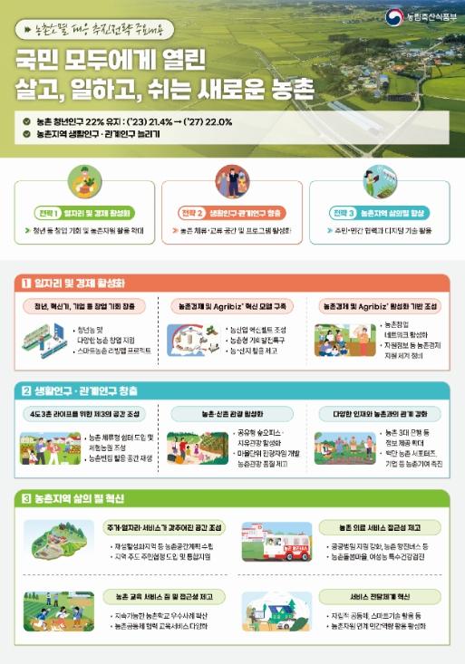 [중앙방송, 김영진 기자] 농림축산식품부는 농촌소멸 대응과 농업·농촌의 새로운 발전 전기 마련을 위해 ‘새로운 농촌(New Ruralism 2024) 패러다임에 따른 농촌소멸 대응 추진전략’을 발표했다.