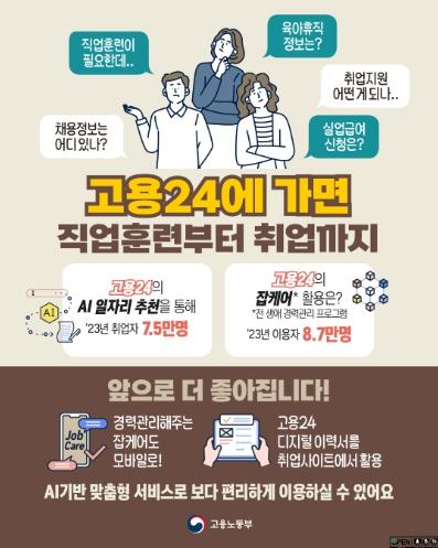 그간 정부는 AI 일자리 매칭, 맞춤형 진로탐색·설계 지원 잡케어 서비스, 디지털 고용서비스 통합플랫폼 ?고용24?에 이르기까지 인공지능·빅데이터 등 신기술을 활용한 디지털 고용서비스 고도화를 추진해 왔다.