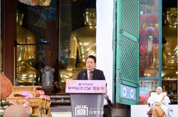 [중앙방송, 이선호기자] 윤석열 대통령은 5월 15일 오전 조계사 대웅전 앞 특설법단에서 열린 '불기 2568년 부처님오신날 봉축 법요식'에 참석했다. 오늘 행사는 대한불교조계종이 주관했으며, 올해의 봉축표어는 "마음의 평화, 행복한 세상"이다.