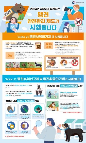 농림축산식품부는 동물복지 선진국으로 도약하기 위해 개 식용 종식의 차질 없는 이행을 위한 관련 후속조치에 만전을 기하고 있다. 또한 개 물림 사고에 대한 국민의 안전관리 강화를 위해 맹견 사육허가제와 기질 평가제를 도입·시행했다. 이와 관련하여 국민이 궁금해 할 수 있는 사항을 문답 풀이(Q&A)로 살펴보았다.