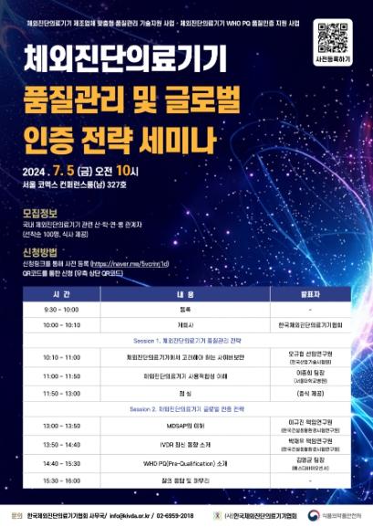 식약처는 이번 세미나가 체외진단의료기기 제조업체의 품질관리 역량 강화와 우수한 국내 체외진단의료기기의 원활한 해외시장 진출에 도움을 줄 것으로 기대하며, 앞으로도 국내 체외진단의료기기 산업의 국제 경쟁력을 높이는 데 필요한 행정적 지원을 지속하겠다고 밝혔다.