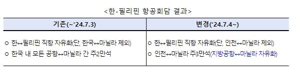 그 결과, 우리나라 지방↔마닐라 노선은 운항횟수 제한없이 취항이 가능해짐에 따라, 언제라도 국적 항공사들의 신규 취항이 가능해졌다.