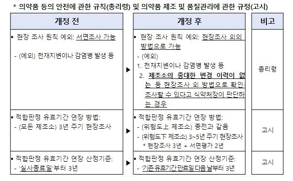 ?현행 천재지변이나 감염병 유행의 경우에만 현장조사 이외의 방법으로 GMP 적합판정 유효기간(3년)을 연장할 수 있으나, 앞으로는 의약품의 품질·안전성에 영향을 미칠만한 제조소의 중대한 변경이력이 없는 등 식약처장이 인정하는 경우에도 현장조사 외 방법으로 유효기간을 연장할 수 있도록 한다.