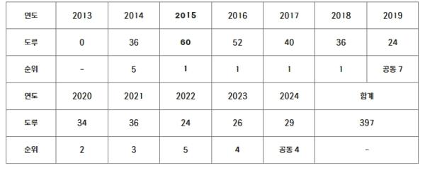 지난 14일 대전 한화전에서 도루 1개를 추가하면서 통산 400도루까지는 3개만을 남겨두게 됐다.
