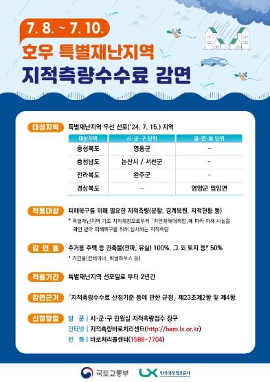 [중앙방송, 김영진 기자] 국토교통부는 호우 피해 복구를 위해 실시하는 지적측량 수수료를 특별재난지역 선포일로부터 2년간 감면한다.