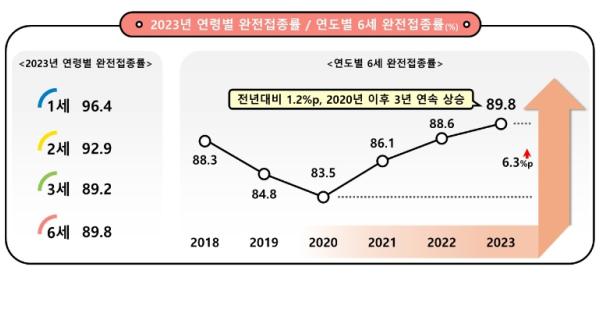 해당 통계에 따르면 2023년 연령별 완전접종률은 1세 96.4%, 2세 92.9%, 3세 89.2%, 6세 89.8%로 나타났다.