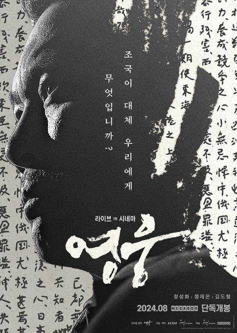 [중앙방송, 류희경기자] 안중근 의사의 의거를 전후로 생애 마지막 1년을 조명한 뮤지컬 실황 '영웅: 라이브 인 시네마'가 오는 8월 21일 개봉을 확정하고 메인 포스터를 공개했다.[감독: 박재석ㅣ출연: 정성화, 정재은, 김도형ㅣ제공: (주)에이콤, (주)위즈온센ㅣ제작: (주)위즈온센ㅣ배급: (주)위즈온센, 메가박스중앙(주)]