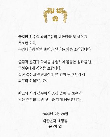 혼성 10m 공기소총에서 은메달을 획득한 금지현 선수에게는 ‘멋진 엄마'라며 응원했다. 대통령은 축전에서 금 선수에게 “훈련과 육아를 병행하여 훌륭한 성과를 낸 금 선수에게 경의를 표합니다. 출전 결심과 훈련 과정에 큰 힘이 된 아이에게 최고의 선물입니다. 최고의 사격 선수이자 멋진 엄마, 금 선수의 남은 경기를 국민 모두와 함께 응원합니다”라고 했다.