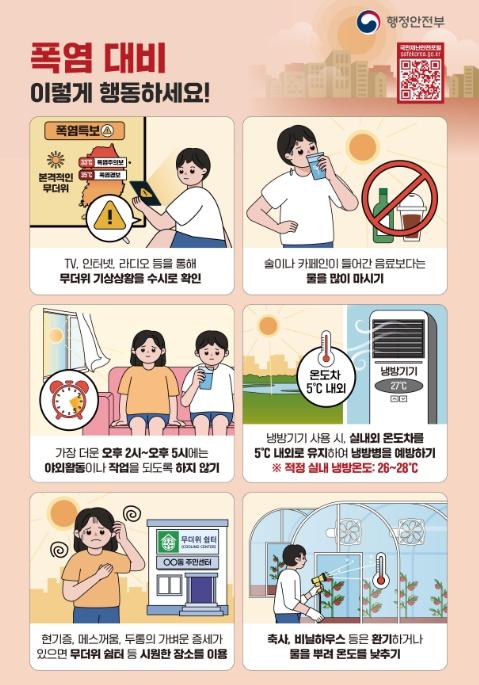 이한경 재난안전관리본부장은 “예년과 달리 폭염이 9월 초까지 이어질 것으로 예상되므로 평년의 기상 상황에 맞춰 계획된 야외 행사나 활동들은 현재 기상 상황을 고려하여 취소 또는 변경할 것”을 요청하면서, “국민께서도 이제껏 경험하지 못한 무더위임을 감안하시어 피해를 입지 않도록 무더운 시간대 야외활동 자제, 충분한 수분 섭취 등 폭염 행동요령을 실천해 줄 것을 당부드린다”라고 말했다.