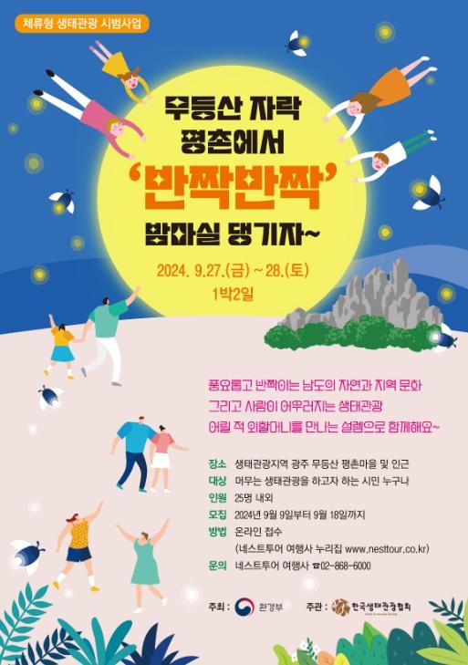 [중앙방송, 이엘리야기자] 환경부는 천혜의 생태관광지를 1박 2일 일정으로 머물며 체험해 볼 수 있는 ‘2024년 체류형 생태관광 체험단(25명)’을 9월 9일부터 18일까지 모집한다.
