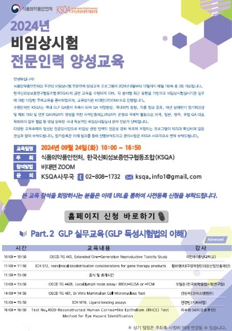9월24일 교육에서는 유전자치료제 비임상 생체분포시험 가이드라인(ICH S12), 인체각막유사 상피모델을 이용한 안(眼) 유해성(심한 안손상 및 안자극) 시험법(OECD TG 492B) 등 동물대체시험법을 포함한 OECD, ICH 비임상시험 가이드라인을 설명하고, 비임상시험을 쉽게 이해할 수 있도록 실제 시험사례도 소개한다.