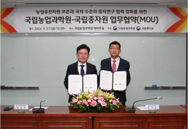 [중앙방송, 김영진 기자] 국립종자원은 농촌진흥청 국립농업과학원과 9월 27일, 농업유전자원 보존 및 세계 수준 종자 연구의 지속적인 협력을 위해 국립농업과학원(전북 완주 소재)에서 업무협약을 체결했다.