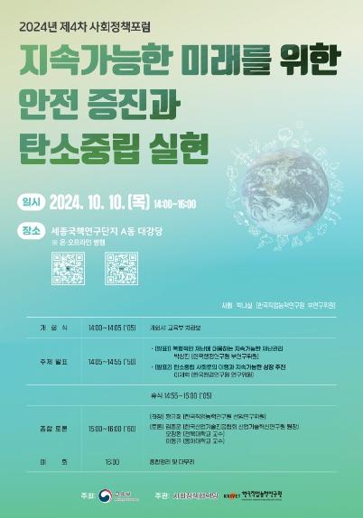 [중앙방송, 이온세기자] 교육부는 ‘지속 가능한 미래를 위한 안전 증진과 탄소중립 실현’을 주제로 10월 10일, 세종국책연구단지에서 제4차 사회정책 공개토론회(포럼)를 개최한다.