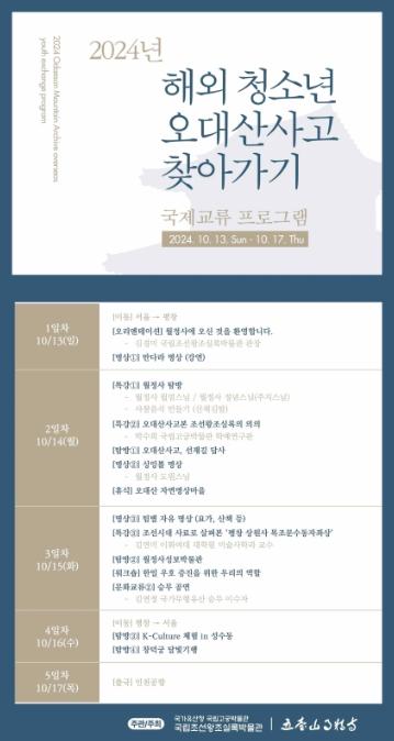 [중앙방송, 김혜영기자] 국가유산청 국립고궁박물관 국립조선왕조실록박물관은 10월 13일부터 17일까지 평창 오대산 월정사 등에서 한일 청소년들을 대상으로 '2024년 해외 청소년 오대산사고 찾아가기 국제교류 프로그램'을 운영한다.