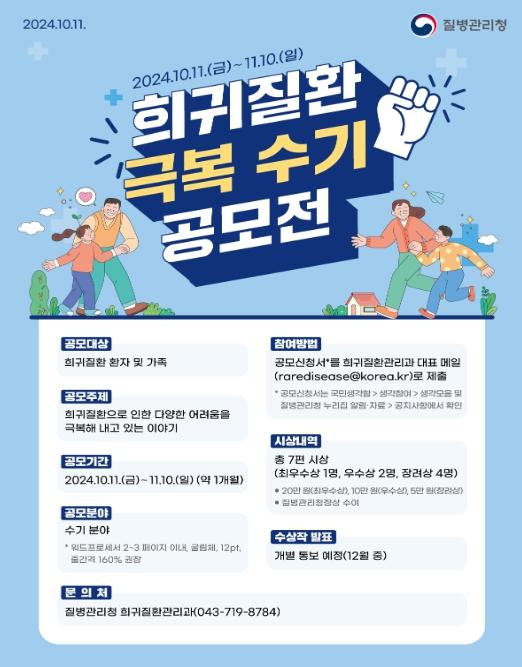 [중앙방송, 서은혁기자] 질병관리청은 희귀질환 환자 및 가족들을 대상으로 희귀질환 극복 사례를 공유하고 희귀질환자들의 정서적 지지체계를 구축하기 위해 10월 11일부터 11월 10일까지 제2회 희귀질환 극복 수기 공모전을 개최한다고 밝혔다.