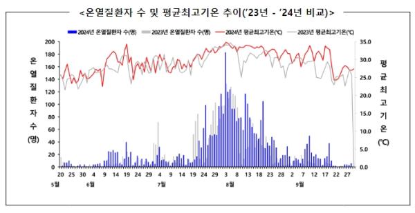 2024년(’24.5.20.~9.30.) ?온열질환 응급실감시체계?로 신고된 온열질환자는 총 3,704명(사망 34명)으로 전년(온열질환자 2,818명, 사망 32명) 대비 31.4% 증가한 것으로 나타났다.